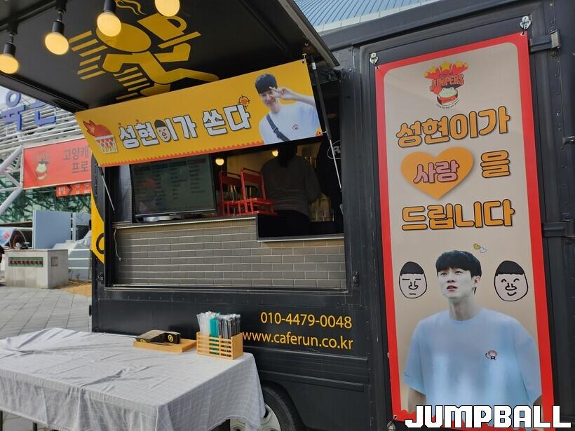 전성현의 세심함은 여기서 그치지 않았다. 갑자기 추워진 날씨 탓에 야외에서 기다려야 하는 팬들을 걱정하며 야외 천막과 난로를 준비했다. 덕분에 줄을 기다리는 팬들은 따듯하게 순번을 기다릴 수 있었다. 또 잠시라도 팬들을 만나기 위해 경기 전 야외부스를 찾아 사진 촬영 시간을 가졌다.