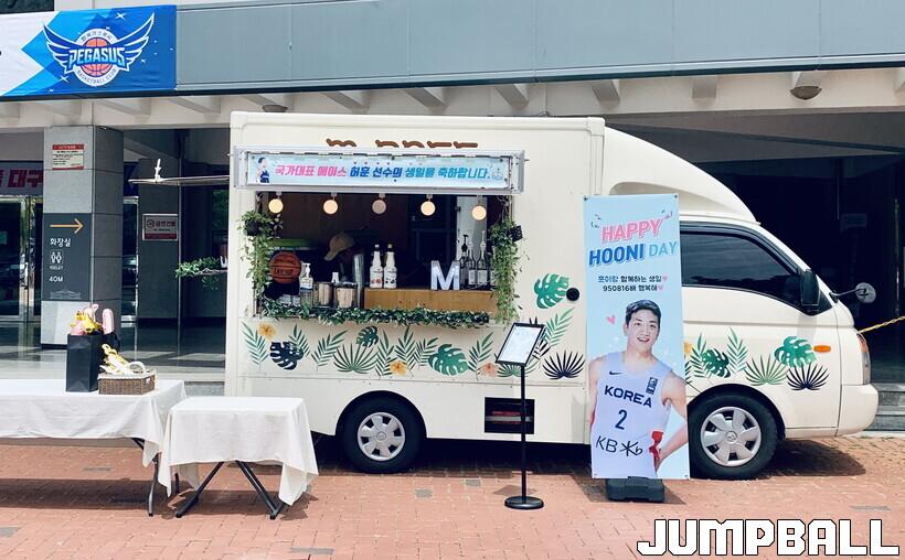 대구체육관 입구에는 ‘국가대표 에이스 허훈 선수의 생일을 축하합니다’라는 문구를 단 커피차가 한 대 서 있었다. 허훈 팬클럽에서 허훈의 생일을 축하하기 위해 준비한 커피차였다. 대표팀과 가스공사 선수단을 위해 120잔 가량 커피와 음료를 제공했다.