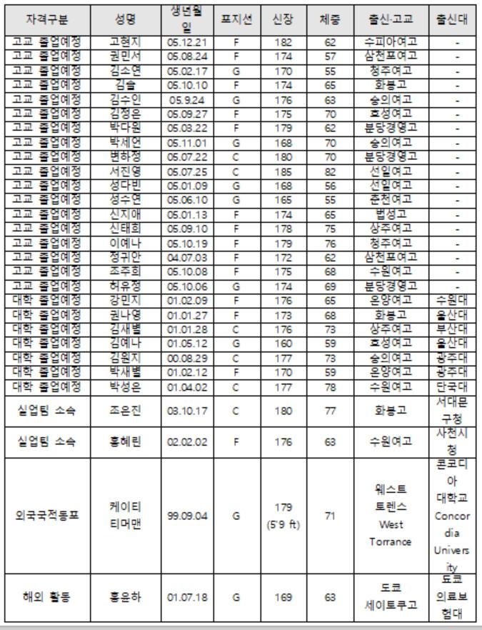 실업팀 소속 선수로는 조은진(서대문구청), 홍혜린(사천시청), 외국국적동포 선수로는 케이티 티머맨(Katie Timmerman, 콘코디아대)이 명단에 포함됐다.