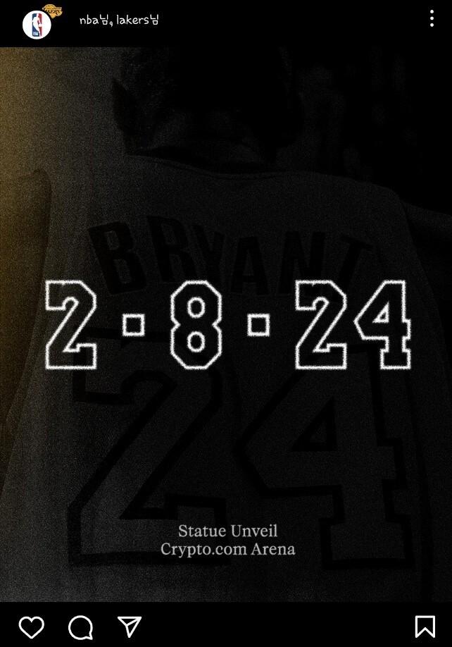 물밑에서 동상 건립을 추진해왔던 레이커스는 마침내 구체적인 계획을 발표했다. 코비의 동상은 현지시간으로 오는 2024년 2월 8일 홈구장인 크립토닷컴 아레나 부근에 세워진다. 코비의 등번호에 둘째딸 지아나 브라이언트의 등번호(2번)를 조합한 날이 동상 공개일로 결정돼 의미를 더했다.