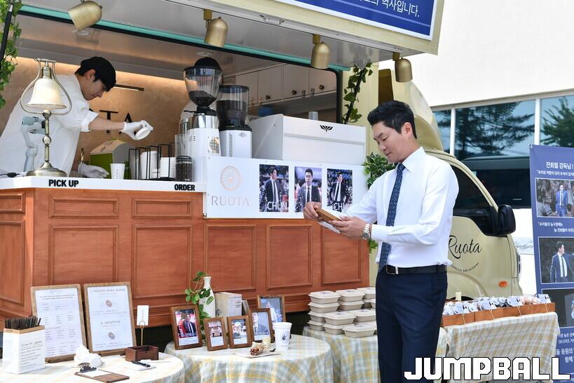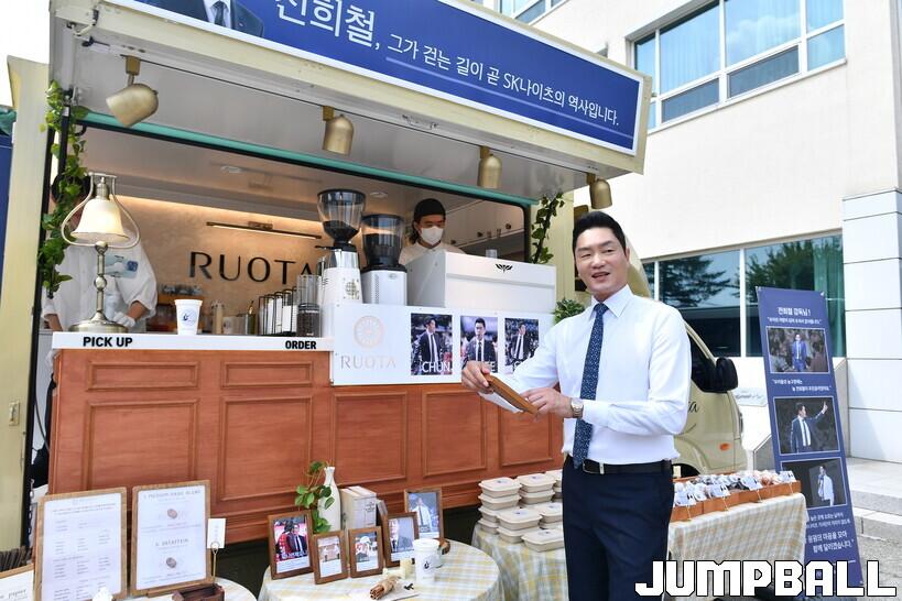 자신의 프로필 촬영 시간에 맞춰 정장을 입고 나온 전희철 감독은 체육관 앞에 마련된 트럭을 발견했다. 그는 “이런건 상민이 형이나 받는건데”라고 말하며 미소를 지었다. 전희철 감독의 이름으로 커피차가 온 것은 이번이 처음이었다.