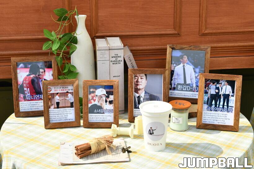 커피 차 앞에 놓인 전희철 감독의 포스터 사진과 액자 등에는 팬들의 정성이 담긴 메시지도 눈길을 끌었다. 전희철 감독은 하나하나 이를 읽으면서 ‘심판과 싸우지 않기’라는 메시지에는 소리를 내며 크게 웃었다. 그는 “팬들과 식사도 하고는 한다. 친하게 지내는 팬의 말투가 그대로 담겨 있다‘고 말했다.
