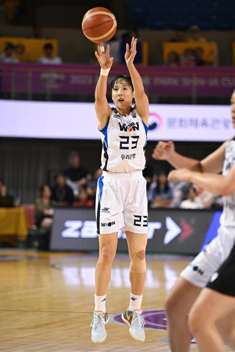 아산 우리은행은 27일 청주체육관에서 열린 2023 우리은행 박신자컵 A조 예선에서 용인 삼성생명을 76-67로 꺾고 2연승을 달렸다. 삼성생명은 대회 첫 경기에서 패배를 당했다.