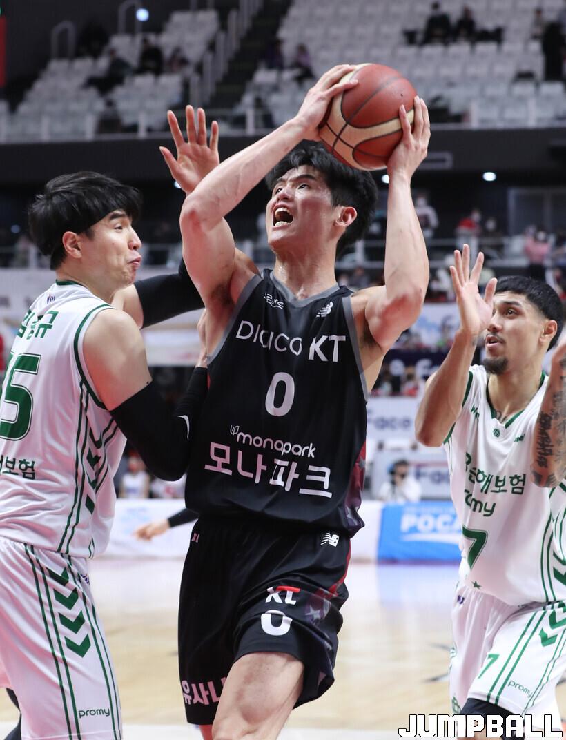 1쿼터를 18-17로 마친 KT는 2쿼터에 기세를 올렸다. 하윤기의 호쾌한 덩크슛을 시작으로 존스가 골밑 득점을 올렸고, 김동욱은 3점슛을 터뜨렸다. DB가 드완 에르난데스와 윤성원을 앞세워 반격했지만 존스와 정성우의 공격으로 맞섰다. 쿼터 막판 양홍석의 외곽포와 하윤기의 레이업을 더한 KT는 39-35로 전반전을 마쳤다.