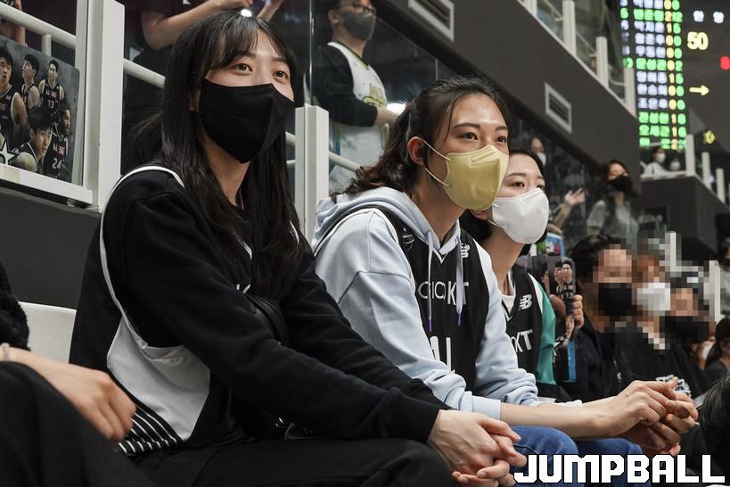 23일 수원 KT 소닉붐 아레나에서 열린 2021-2022 KGC인삼공사 정관장 프로농구 플레이오프 수원 KT와 안양 KGC 2차전 경기, 여자프로배구 현대건설 김다인, 양효진, 이다현이 2층 관중석에서 관전을 하고 있다.