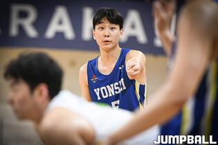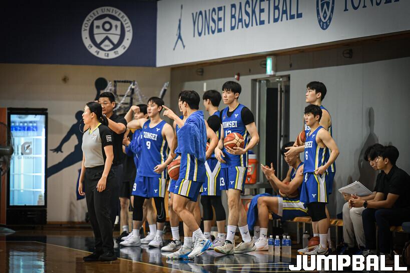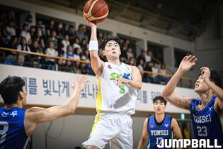 11일 연세대학교 신촌캠퍼스 체육관에서 열린 2023 KUSF 대학농구 U-리그 연세대와 성균관대의 경기, 연세대 선수들이 환호하고 있다.
