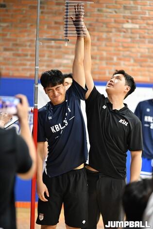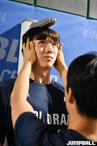 12일 서울 강남 KBL 트레이닝 센터에서 열린 2023 KBL 신인선수 드래프트 컴바인, 고려대 신주영이 윙스팬을 측정하고 있다. [점프볼=논현/유용우 기자]
