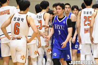 4일 한양대학교 올림픽체육관에서 열린 2023 KUSF 대학농구 U-리그 한양대와 동국대의 경기, 한양대 김주형이 패턴 지시를 하고 있다.