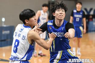 2일 연세대 신촌캠퍼스 체육관에서 열린 2023 KUSF 대학농구 U-리그 연세대와 중앙대의 경기, 연세대 김보배가 속공을 시도하고 있다.