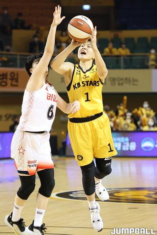 31일 청주실내체육관에서 열린 '삼성생명 2021-2022 여자프로농구 플레이오프' 청주 KB와 부산 BNK의 경기. KB 김소담이 점프슛을 던지고 있다.