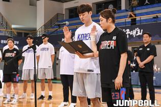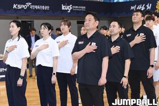 19일 연세대 신촌캠퍼스 체육관에서 제46회 한일 대학선발 농구대회 1일차 경기가 열렸다. 경기 시작 전 국민의례를 가졌다.