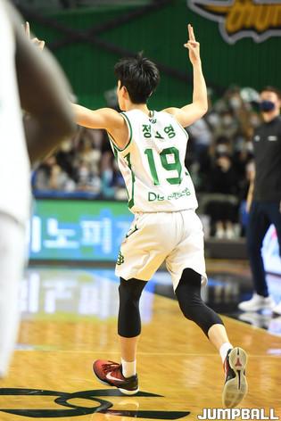 26일 잠실실내체육관에서 열린 2021-2022 KGC인삼공사 정관장 프로농구 서울 삼성과 원주 DB의 경기, DB 정호영이 3점슛을 성공시킨후 세레머니를 하고 있다.