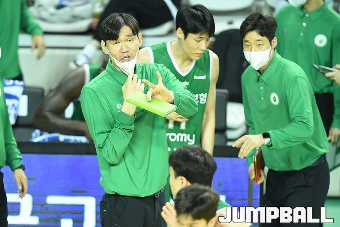 5일 원주종합체육관에서 열린 2021-2022 KGC인삼공사 정관장 프로농구 원주 DB와 창원 LG의 경기, DB 김주성 코치가 작전을 지시하고 있다.