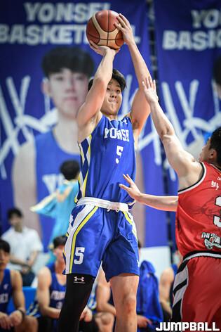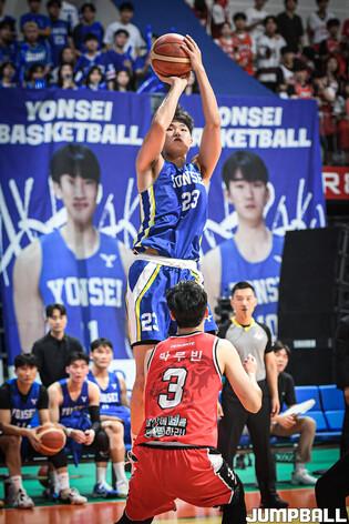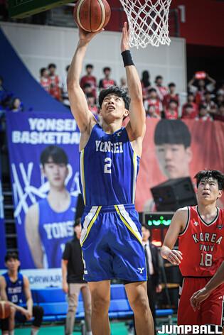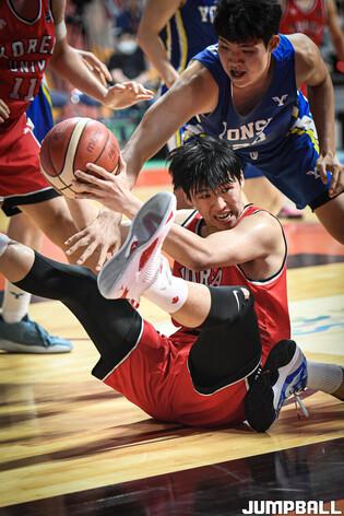 8일 고양체육관에서 열린 2023 정기 고연전, 고려대 윤기찬이 볼을 뺏기지 않기 위해 팀 동료를 찾고 있다.