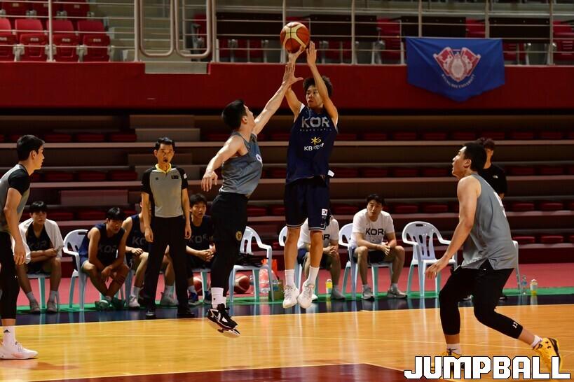 경희대 김현국 감독의 제안으로 삼파전 연습경기가 열렸다. 대표팀은 먼저 경희대와 경기를 시작했다. 형들과 연습경기를 앞두고 동생들의 얼굴에는 긴장한 기색이 역력했다. 이후 상무와 연습경기에서도 선수들의 표정에는 긴장이 가득했다. 연습경기는 각 2쿼터씩 진행됐다.