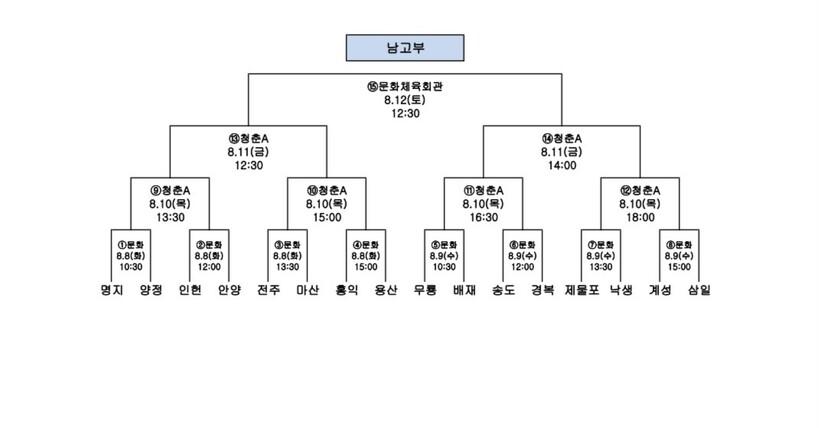 남고부 16강전은 모두 양구군문화체육회관에서 열리며 명지고와 양정고의 맞대결로 막을 올린다. 인헌고와 안양고, 전주고와 마산고, 홍대부고와 용산고, 무룡고와 배재고, 송도고와 경복고, 제물포고와 낙생고, 계성고와 삼일고가 맞대결을 펼친다. 8일 4경기, 9일 4경기를 펼쳐 8강행 주인공을 가릴 예정이다.