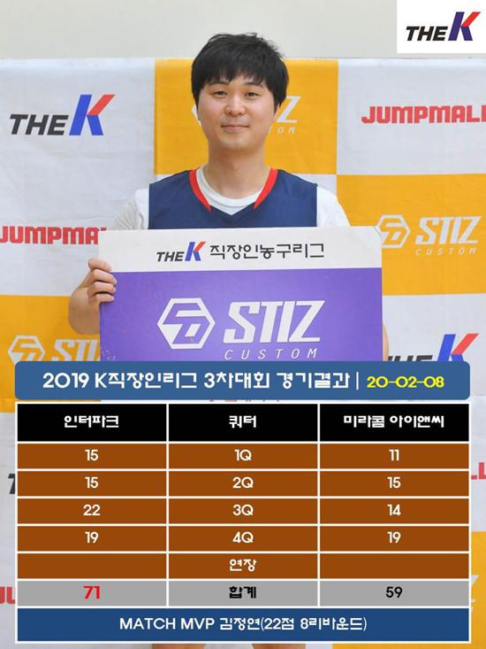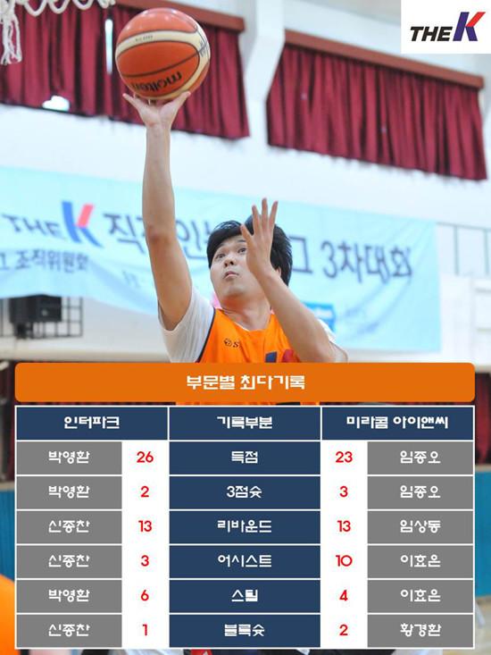 인터파크는 8일 서울 관악고등학교 체육관에서 열린 STIZ배 2019 The K직장인농구리그(www.kbasket.kr) 3차대회 디비전 3 준결승에서 박영환(26점 6리바운드 6스틸, 3점슛 2개), 김정연(22쩜 8리바운드), 신종찬(12점 13리바운드 3어시스트) 등 고른 활약을 펼친 데 힘입어 미라콤 아이앤씨를 71-59로 잡고 결승진출에 성공했다.