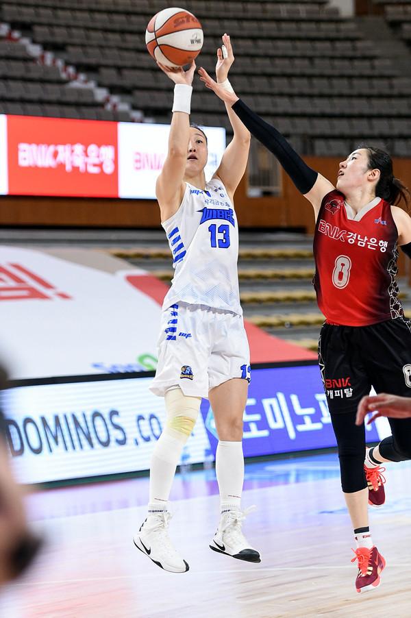 아산 우리은행은 29일 부산 스포원파크 BNK센터에서 열린 하나원큐 2019~2020 여자프로농구 원정경기에서 부산 BNK를 61-57로 꺾었다. 우리은행은 19승 6패를 기록하며 청주 KB스타즈와 공동 1위에 올랐다.