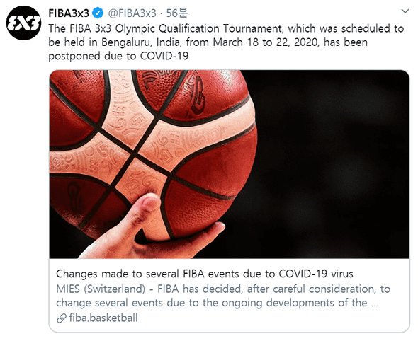 가장 급한 불이었던 2020 도쿄올림픽 3x3 농구 1차 예선부터 연기됐다. FIBA는 오는 3월18일부터 22일까지 인도 벵갈루루에서 개최 예정이었던 올림픽 1차 예선은 일단 개최를 연기하기로 결정했고, 정확한 연기 일정은 공지하지 못했다.