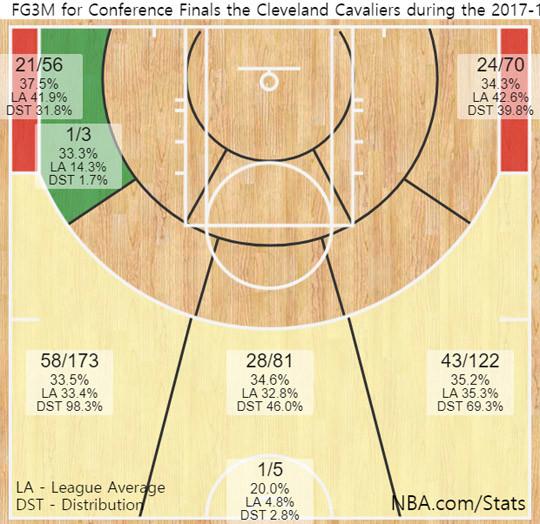#2017-2018시즌 PO 동부 컨퍼런스 파이널 CLE 3점슛 성공률 분포도(*26일 기준)