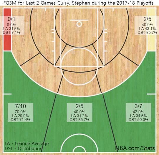 #2017-2018시즌 파이널 첫 2경기 스테판 커리 3점슛 성공률 분포도(*5일 기준)