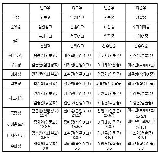 남중부에서 아쉽게 준우승에 그친 대전중의 유망주 이규태(197cm, C)는 우수상과 리바운드상의 주인이 되었고, 수피아여중 이해란(182cm, C)도 득점상과 리바운드상을 휩쓸었다.