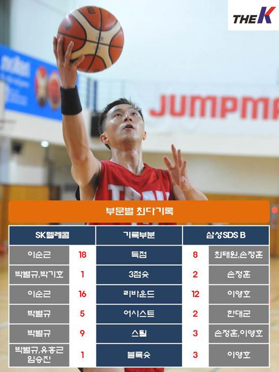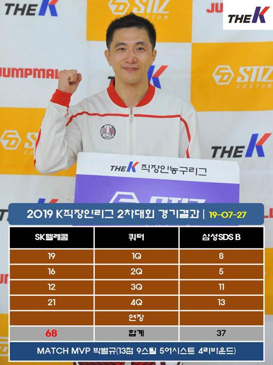 SK텔레콤은 27일 서울 인헌고등학교 체육관에서 열린 STIZ배 2019 The K직장인농구리그(www.kbasket.kr) 2차대회 디비전 1 예선전에서 대들보 이순근(18점 16리바운드 3어시스트)을 필두로 2년 10개월여만에 복귀신고를 알린 박별규(13점 9스틸 5어시스트 4리바운드)와 임승진(10점 7리바운드) 활약에 힘입어 삼성SDS B를 68-37로 잡고 파죽의 3연승을 내달렸다.