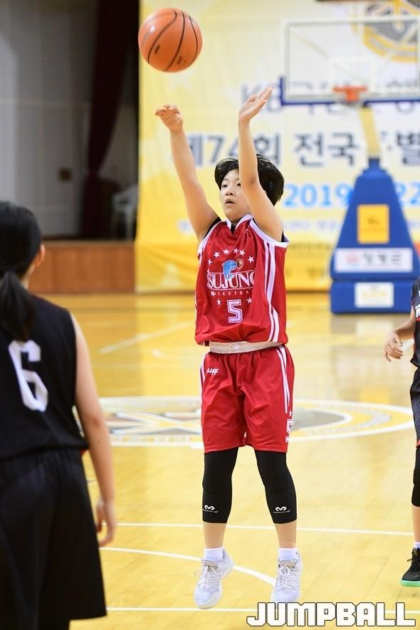 성남수정초는 31일 전남 영광스포티움 국민체육센터에서 열린 KB국민은행과 함께하는 제74회 전국종별농구선수권대회 대구월배초와의 여초부 4강 1경기에서 50-22로 대승을 거뒀다. 초반부터 리드를 잡아나간 성남수정초는 꾸준하게 상대와의 격차를 벌려가면서 손쉽게 결승행 티켓을 거머쥐었다.