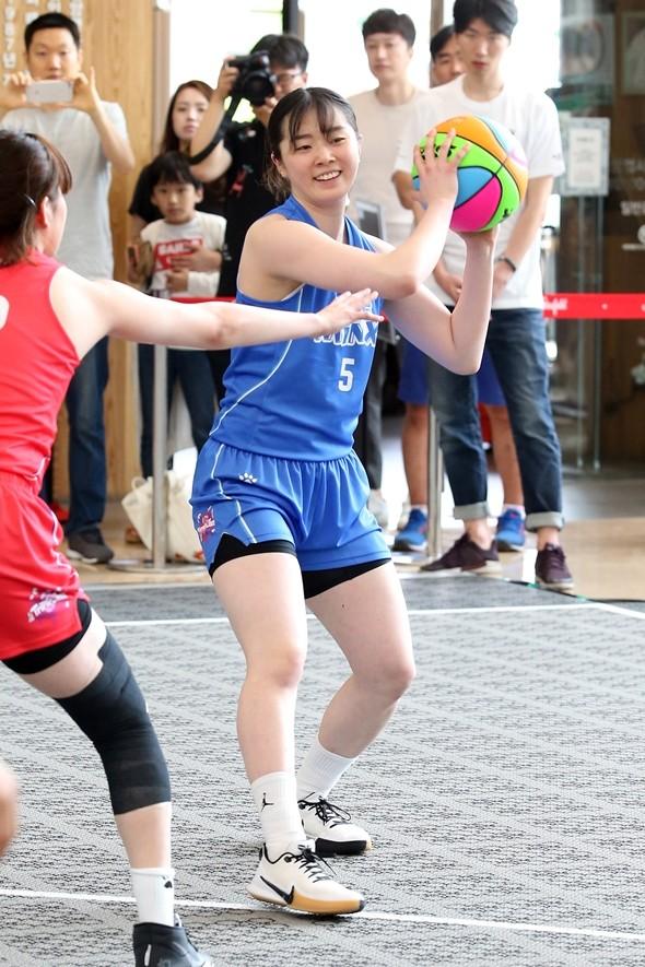 4일 스타필드 하남에서 열린 2019 신한은행 3x3 트리플잼 3차 대회. 앞선 1,2차 대회와는 달리 3차 대회는 WKBL 6개 구단들의 진검 승부가 펼쳐진다. 예선 첫 경기는 A조에 속한 부천 KEB하나은행과 용인 삼성생명이 맞붙은 가운데, 2회 연속 우승을 차지한 KEB하나은행을 상대로 빼어난 활약을 펼친 신예가 눈에 띄었다.