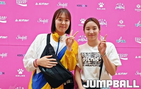 4일 스타필드 하남에서 열린 2019 신한은행 3x3 트리플잼 3차 대회. 오전 10시부터 시작된 대회는 WKBL 6개 구단의 조별 예선을 거쳐 4강에 돌입한 상태다. A조에서는 용인 삼성생명과 부천 KEB하나은행, B조에서는 인천 신한은행과 부산 BNK가 4강에 오른 가운데, 이날 현장에는 여유 있는 미소와 함께 팀원들을 열렬히 응원하는 두 사람이 눈에 띄었다.