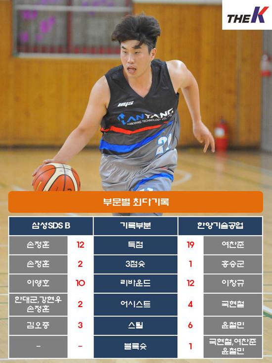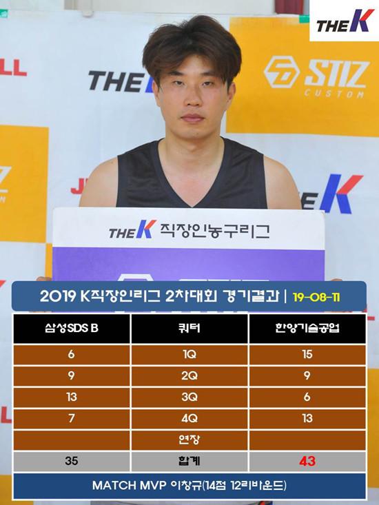 한양기술공업은 10일 서울 인헌고등학교 체육관에서 열린 STIZ배 2019 The K직장인농구리그(www.kbasket.kr) 2차대회 디비전 1 예선전에서 여찬준(19점 8리바운드), 이창규(14점 12리바운드)가 33점 20리바운드를 합작한 데 힘입어 삼성SDS B 맹렬한 추격을 43-35로 따돌리고 승리를 챙겼다.