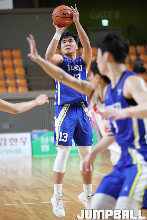 연세대는 경기 초반 김경원(198cm, C)과 김무성(185cm, G) 중심으로 공격을 풀어갔다. 이들은 전반에 13점을 몰아쳤다. 김경원은 1쿼터 야투율 100%(3/3)를 기록했다. 골밑에선 한승희(197cm, F,C)가 돋보였다. 홀로 5개의 리바운드를 걷어내며 제공권 단속에 힘썼다.