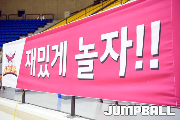 대부분 구단이 ‘화이팅’이나 ‘파이팅’이란 단어를 플래카드에 넣었지만, LG는 “재밌게 놀자”라는 플래카드를 걸어놓았다. 농구의 재미를 붙이고 있는 유소년들을 위한 이번 대회와 유독 잘 어울린다.