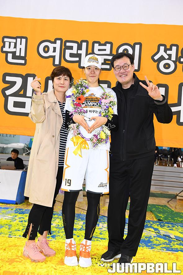 올 시즌 최연소 트리플더블러, 정규리그 MVP에 플레이오프까지 거머쥔 박지수. 딸의 성장을 지켜본 부부는 기념사진을 남기고, 박지수에게 수고했다는 격려의 말을 남기고 경기장을 떠났다.
