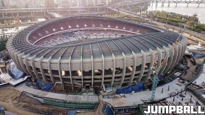 ▲ 서울시가 본격 추진 중인 종합운동장 일대 재개발 사업에 따라 잠실실내체육관은 이번 시즌을 끝으로 철거가 진행되며 새로운 모습을 준비한다. 리모델링 진행중인 주경기장 |