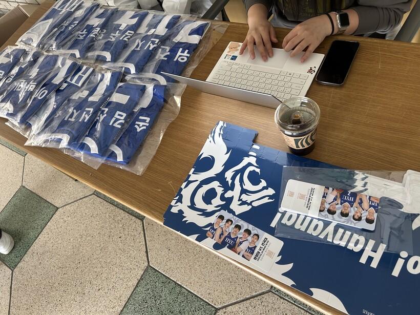 ▲경기장에서 레플리카와 티켓 및 클래퍼를 배부 중인 부원들