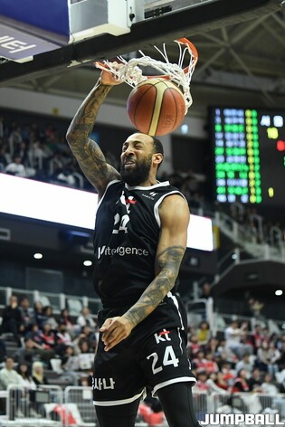 [점프볼=수원/유용우 기자] 14일 KT 소닉붐 아레나에서 열린 2025-2026 LG전자 프로농구 수원 KT과 서울 SK의 경기, SK 자밀 워니가 득점에 성공하고 백코트하고 있다.