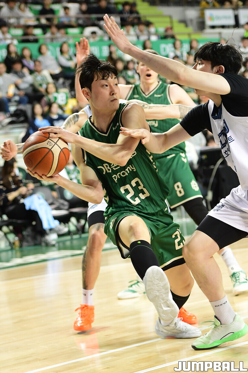 [점프볼=원주/박상혁 기자] 7일 원주 DB 프로미 아레나에서 열린 2025-2026 LG전자 프로농구 원주 DB와 고양 소노의 경기, DB 박인웅이 볼을 받아줄 동료를 찾고 있다.