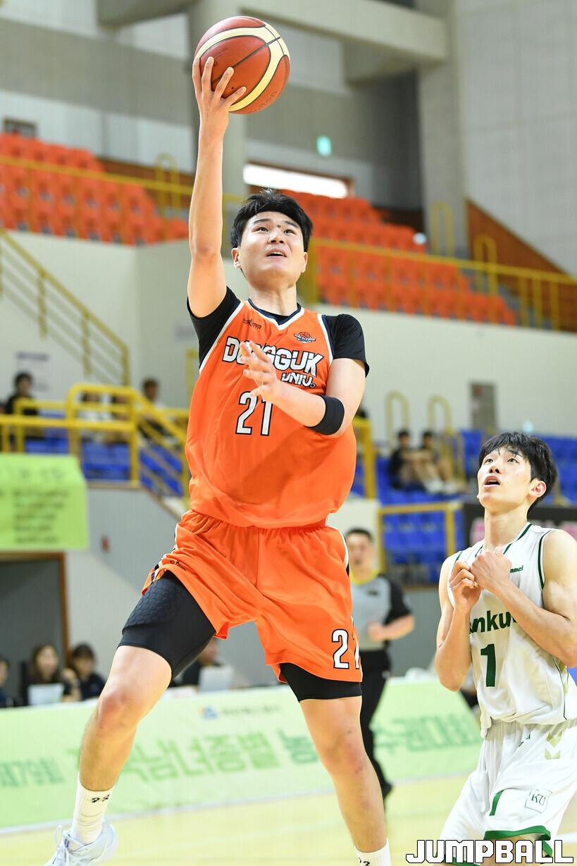 동국대는 1쿼터 막판 김명진의 득점력을 앞세워 1쿼터를 21-14로 마쳤다. 2쿼터부터 건국대의 지역방어에 고전했다. 실책이 실점으로 이어졌다. 2쿼터 한 때 34-37로 역전 당했다. 이상현의 코너 3점슛 덕분에 39-39, 동점으로 전반을 마무리했다.
