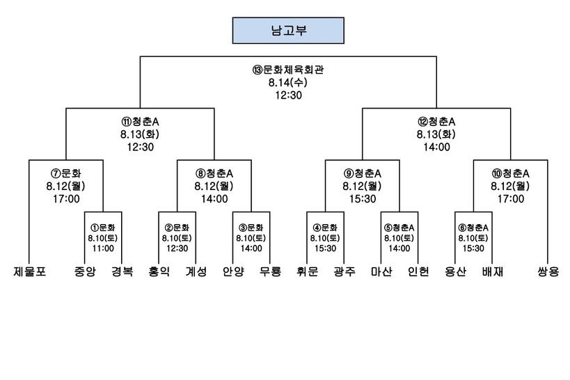 남고부는 14강 결선은 오는 10일 오전 11시 문화체육회관에서 부산중앙고와 경복고 경기를 시작으로, 홍대부고-계성고, 안양고-무룡고, 휘문고-광주고, 마산고-인헌고, 용산고-배재고가 맞붙는다.