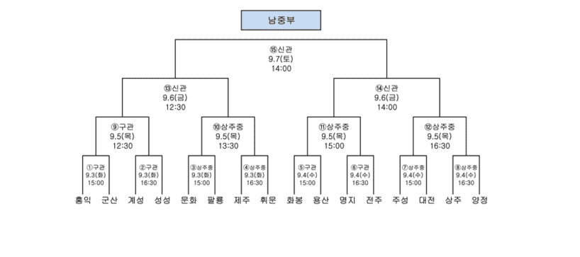 3일 홍대부중과 군산중의 경기로 남중부 16강 토너먼트가 시작된다. 계성중-천안성성중, 문화중-팔룡중, 제주동중-휘문중, 화봉중-용산중, 명지중-전주남중, 주성중-대전중, 상주중-양정중이 각각 맞붙는다.