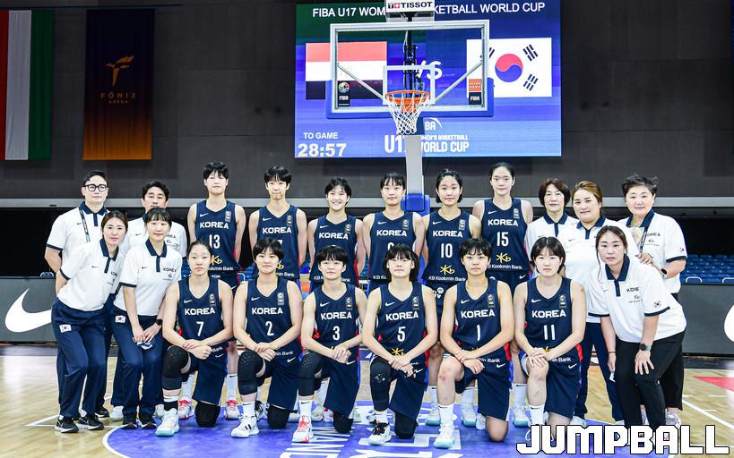 9일 헝가리 데브레첸 포닉스 아레나에서 열린 2022 FIBA U17 여자농구월드컵 한국과 이집트의 경기, 한국대표팀이 경기 시작 전 기념 사진 촬영을 하고 있다.