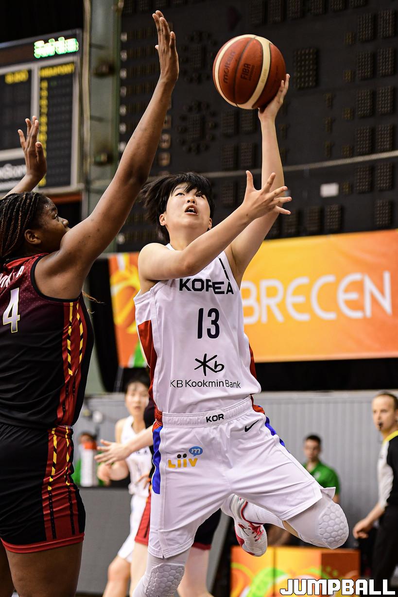 17일 헝가리 데브레첸 올라 가보 스포츠홀에서 열린 2022 FIBA U17 여자농구월드컵 한국과 벨기에의 순위결정전 13-14위전 경기, U17 여자농구대표팀 김채원이 골밑에서 슛을 시도하고 있다.