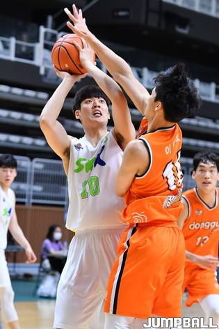 [점프볼=수원/홍기웅 기자] 5일 수원 서수원칠보체육관에서 열린 '2021 KUSF 대학농구 U-리그 3차대회' 동국대와 성균관대의 경기. 성균관대 김수환이 더블클러치를 시도하고 있다.