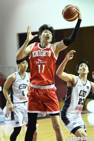 [점프볼=용인/유용우 기자] 24일 경희대 선승관 체육관에서 열린 2025-2026 KBL D리그 서울 SK와 부산 KCC의 경기, SK 김명진이 리바운드를 경합하고 있다.