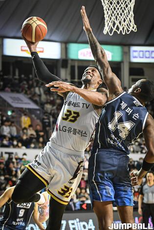5일 전주실내체육관에서 열린 2022-2023 SKT 에이닷 프로농구 전주 KCC와 창원 LG의 경기, LG 김준일이 레이업슛을 시도하고 있다.