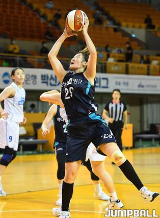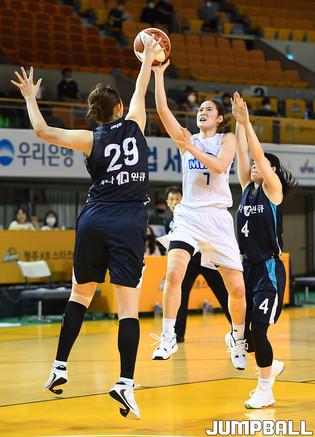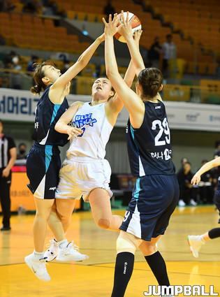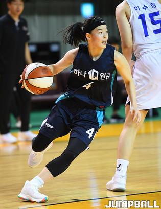 [점프볼=청주/문복주 기자] 17일 청주체육관에서 열린 '2020 우리은행 박신자컵 서머리그' 하나원큐와 삼성생명의 경기, 하나원큐 이채은과 이정현이 골밑에서 더블 블로킹을 하고 있다.