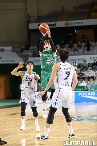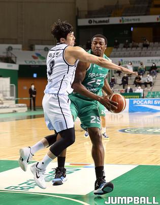[점프볼=원주/한명석 기자] 25일 원주종합체육관에서 열린 2020-2021 현대모비스 프로농구 원주DB와 전주KCC와의 경기, 원주 DB 타이릭 존스 선수가 덩크를 성공시키고 팬들에게 세레모니를 하고 있다.
