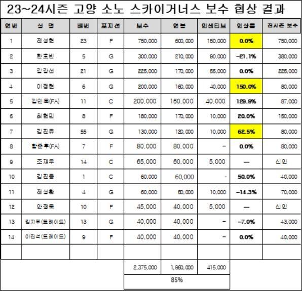 고양 소노는 9일 “지난달 25일부터 시작했던 선수와의 보수 협상을 8일에 마치며 2023-2024시즌 KBL 선수 등록을 완료했다”라고 밝혔다. 소노의 보수 합계는 23억 7500 만 원이며, 샐러리캡 소진율은 85%다.