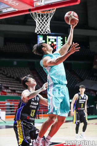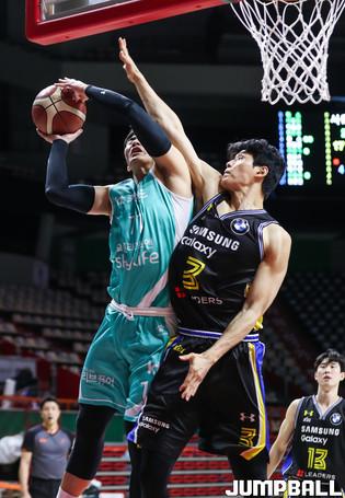 [점프볼=윤민호 기자] 2 사직실내체육관에서 열린 2020-2021 현대모비스 프로농구 부산 KT 서울 삼성의 경기에서 삼성 김광철이 KT 김영환의 수비를 피해 슛을 하고 있다.
